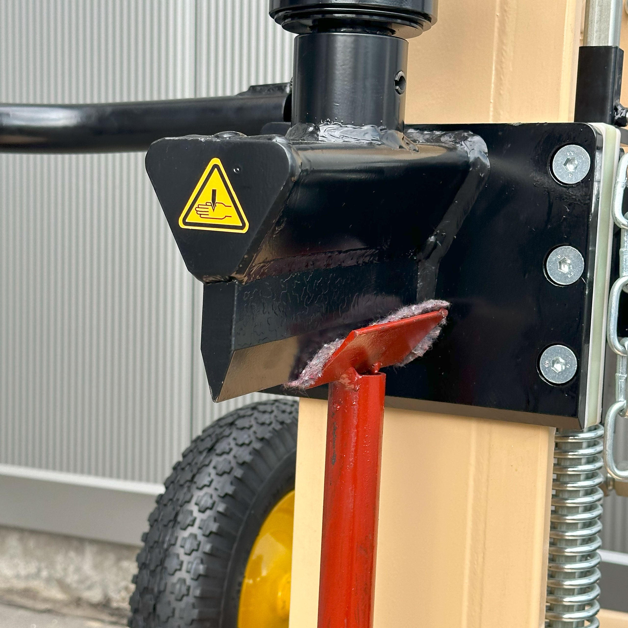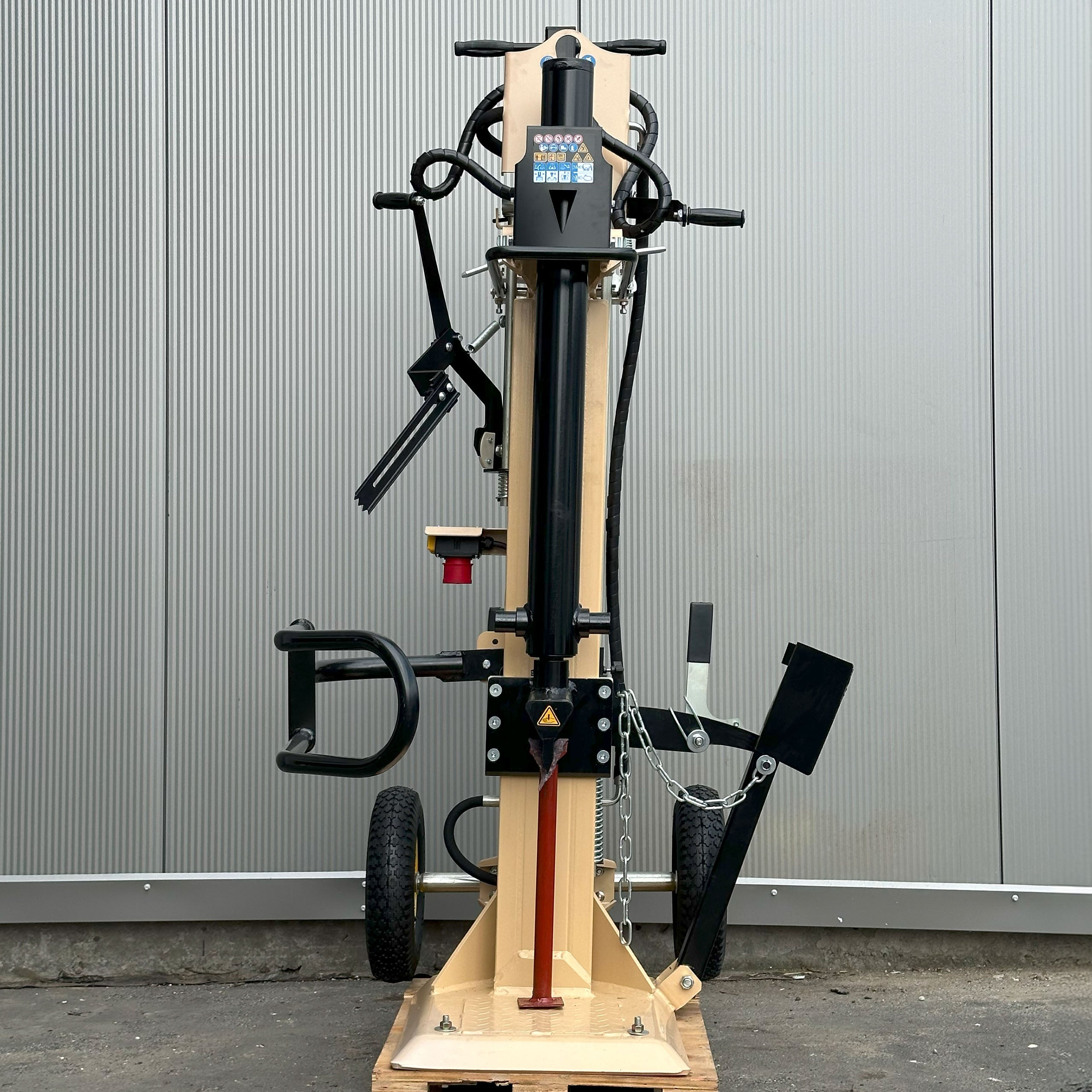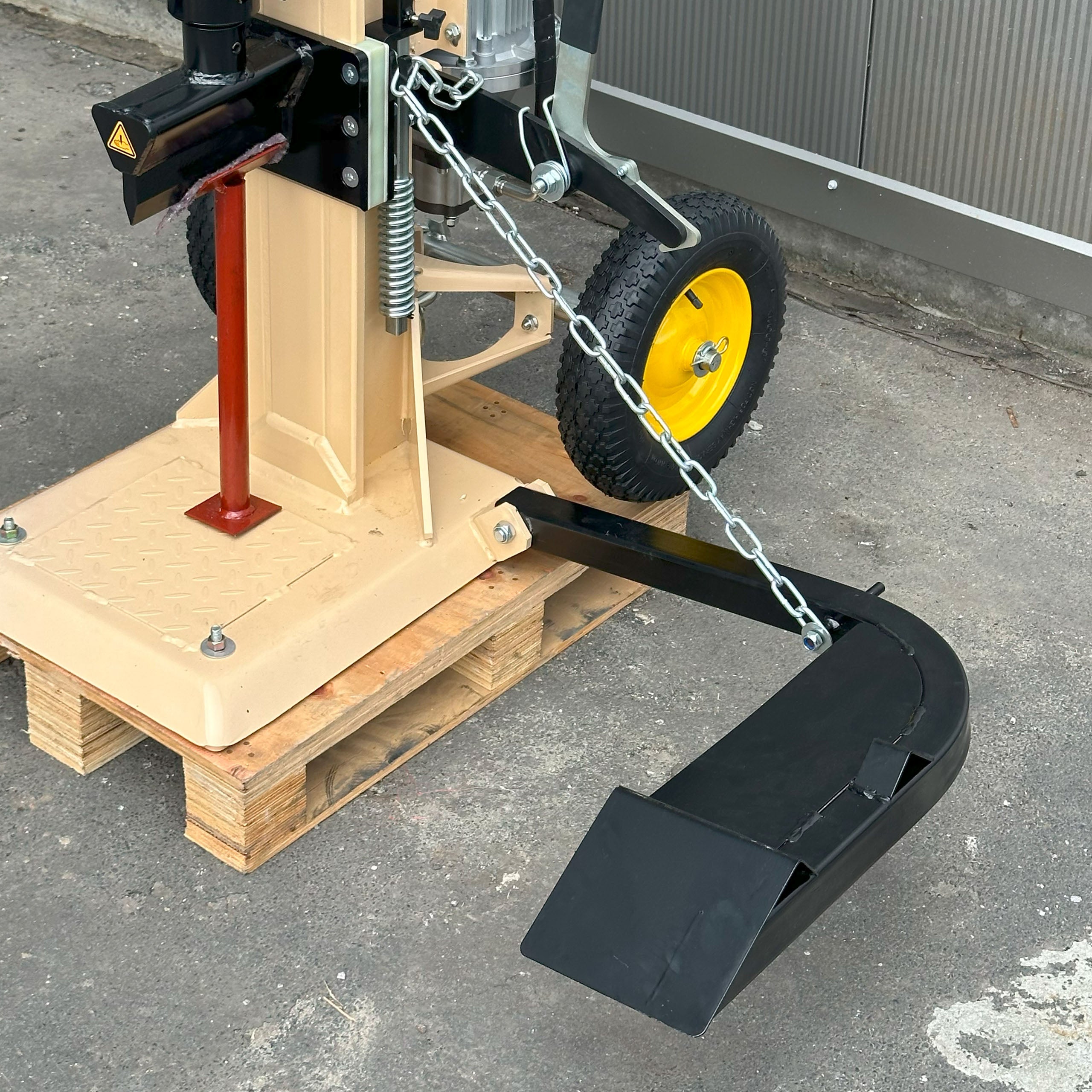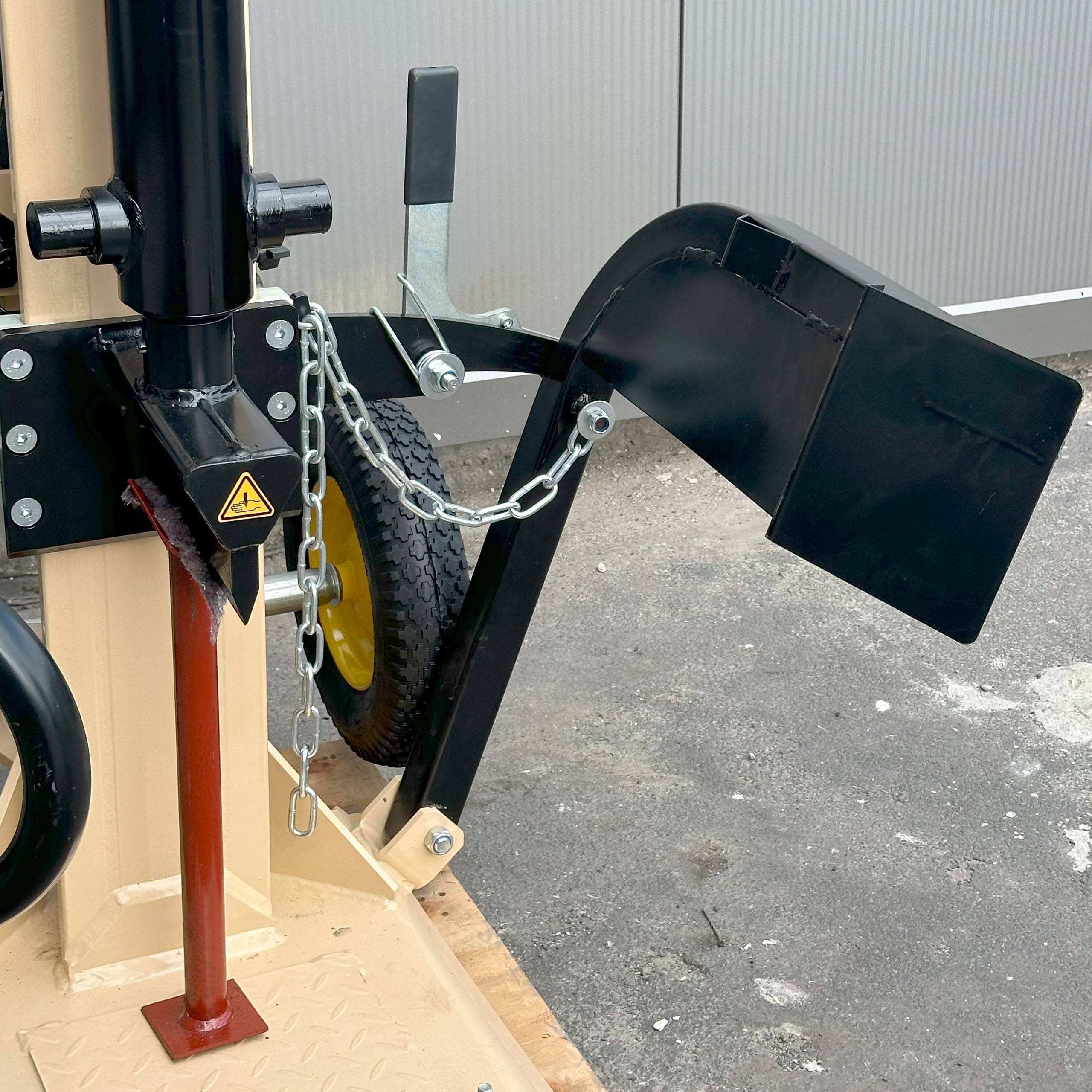 - Mobilność łuparki zapewniają pompowane koła i solidny uchwyt transportowy.